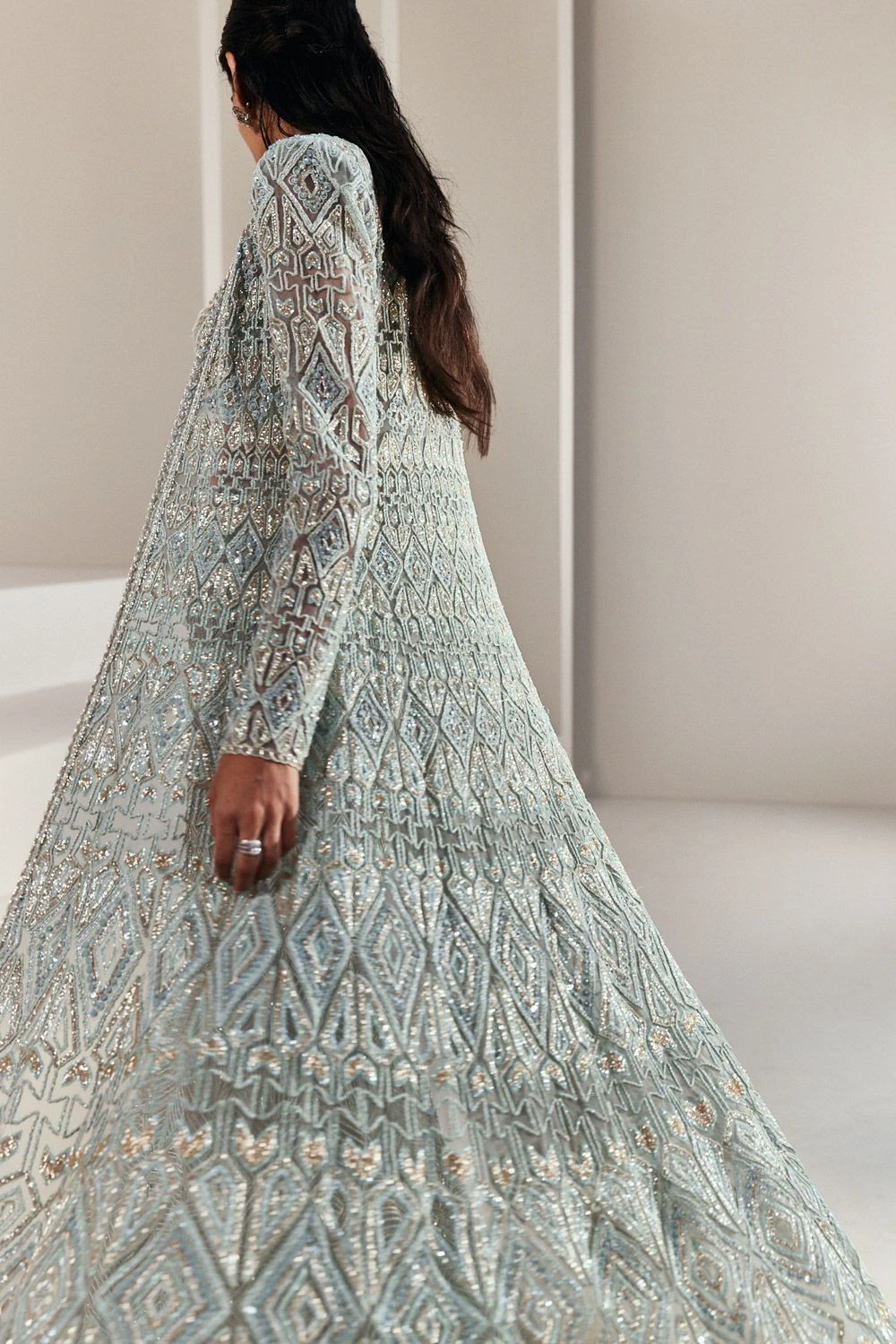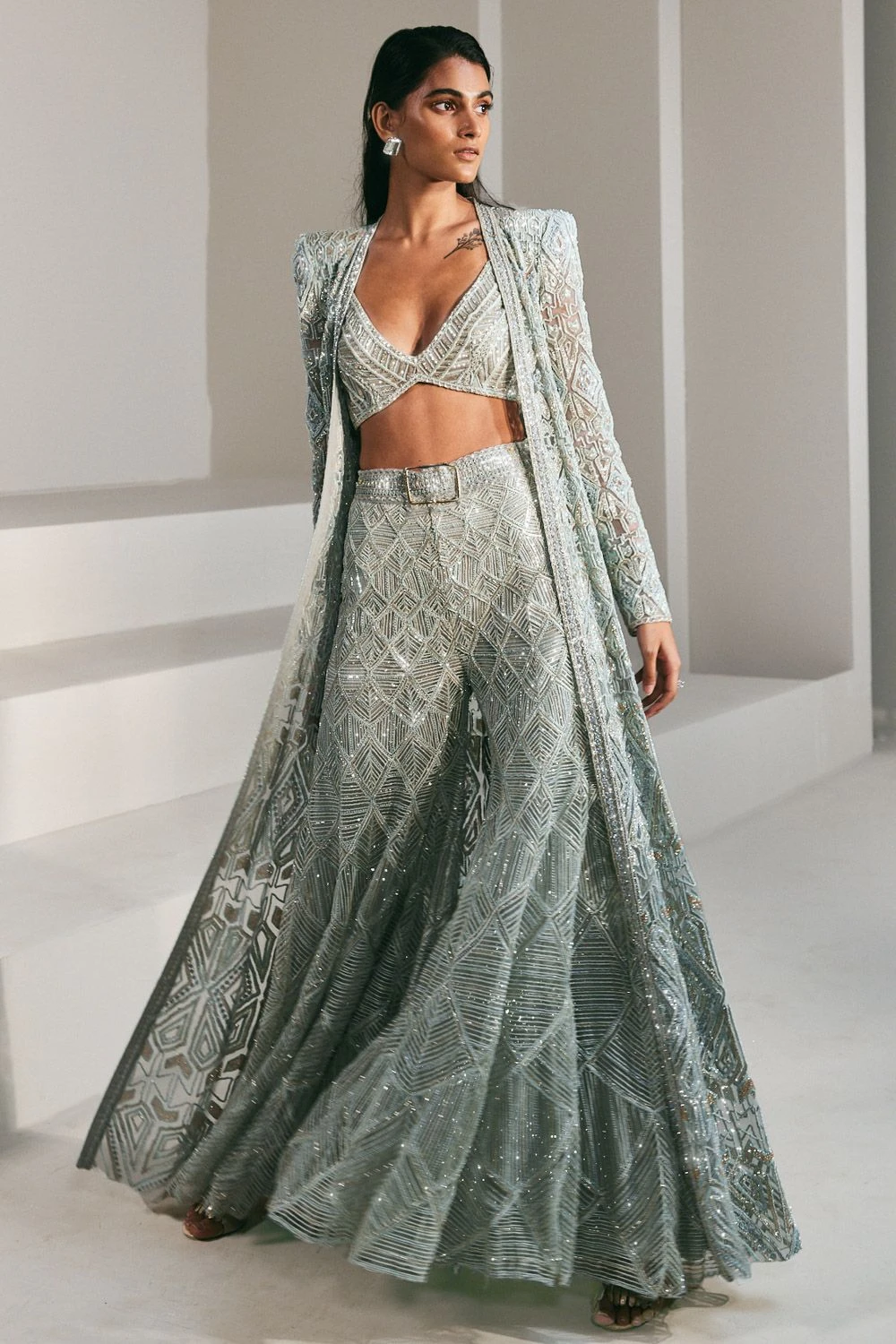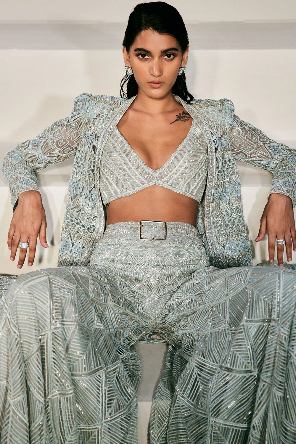 With its contemporary embroidery details and fresh green hues, this jacket set is a must-have during the festive season. It features a net based green & gold hand embroidered jacket, paired with bustier, sharara pants and a buckle belt.