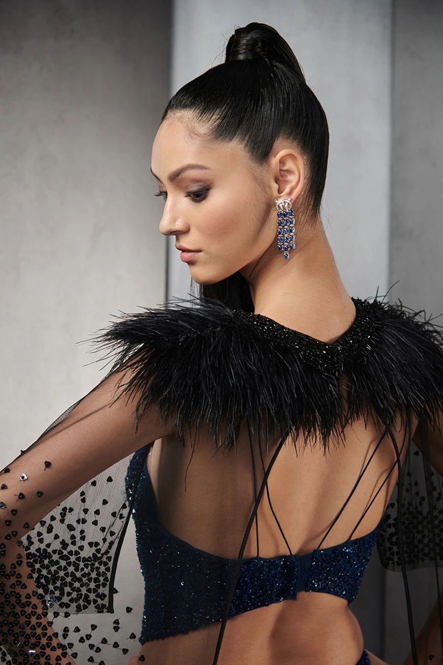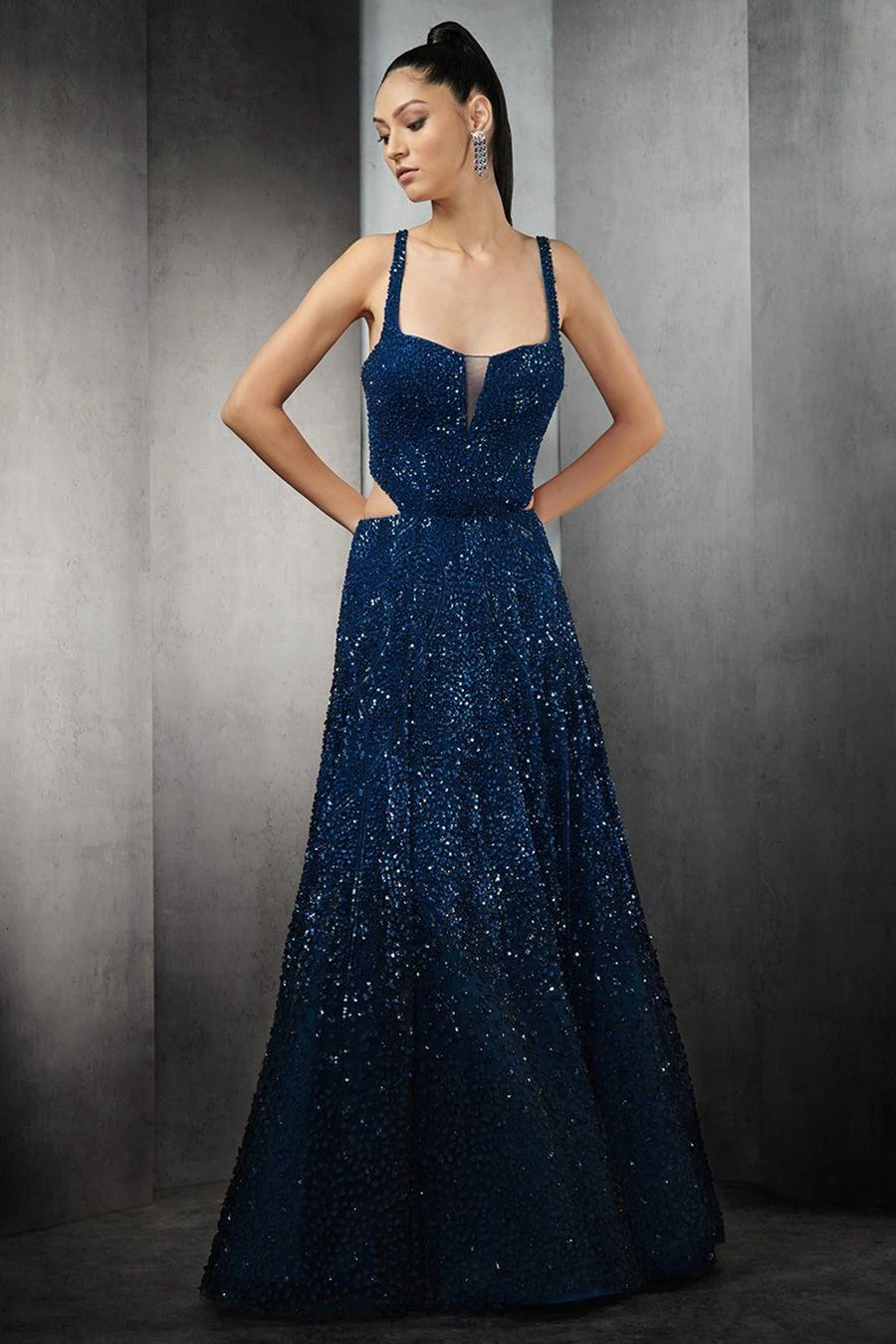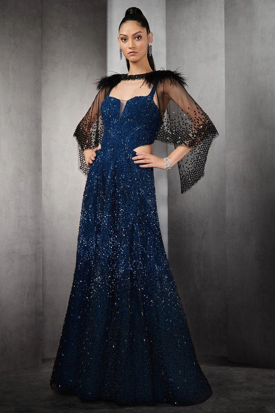 If you’re looking for a head-turning statement-making gown, this is the dress for you. Crafted in tulle, This densely embellished gown with sequins and crystals all over has a handcrafted silk organza fray at the bottom.