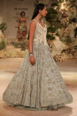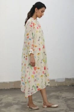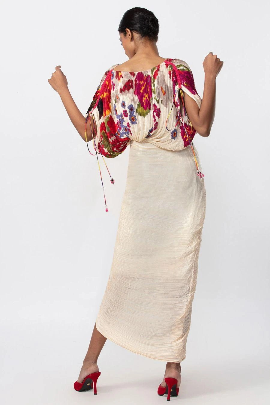 Add a layer of statement and glamour to your resort getaways with this sari dress. Crafted in cotton silk, this micro pleated dress features a floral print with adjustable drawstring sleeves. Add a pair of dangler earrings to complete the look.