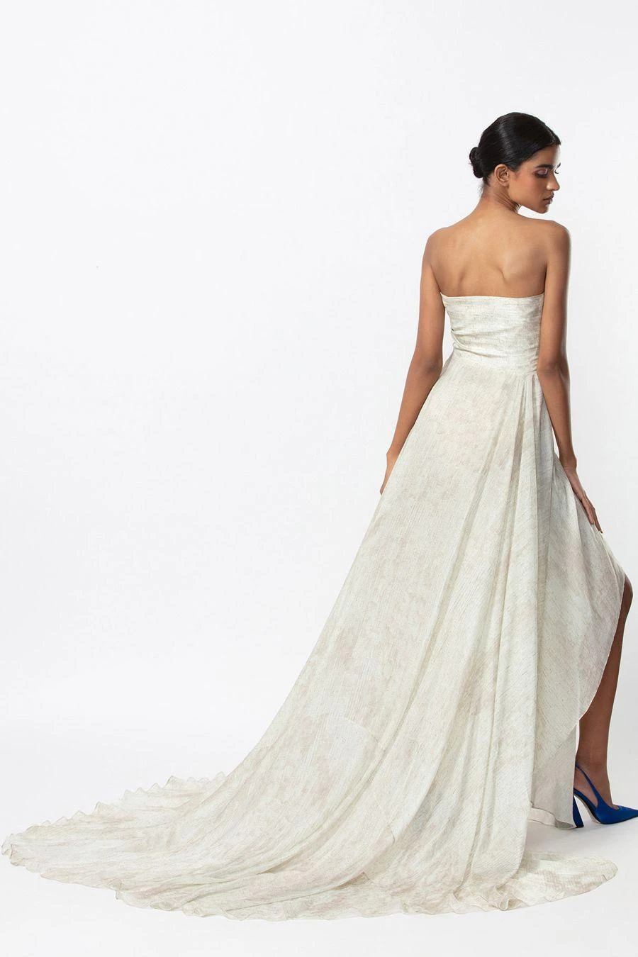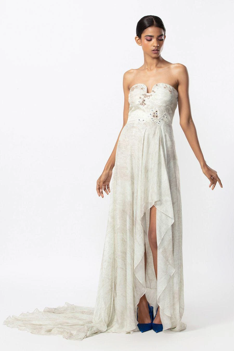 Add a layer of statement & glamour to your resort getaways with this gown. Crafted in chiffon & satin, this dress features an abstract print with intricate mirror and thread embellished details. Add a pair of dangler earrings to complete the look.