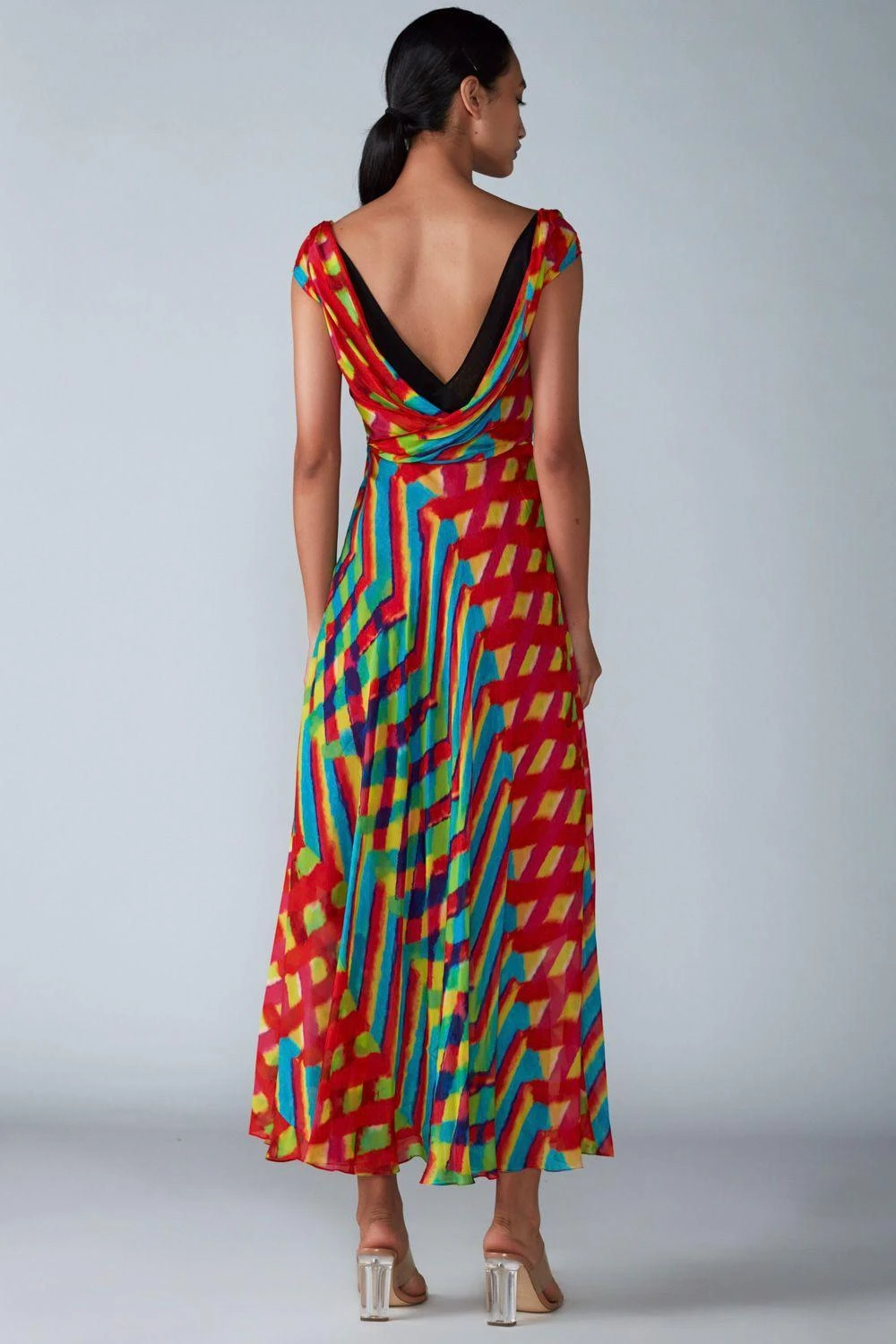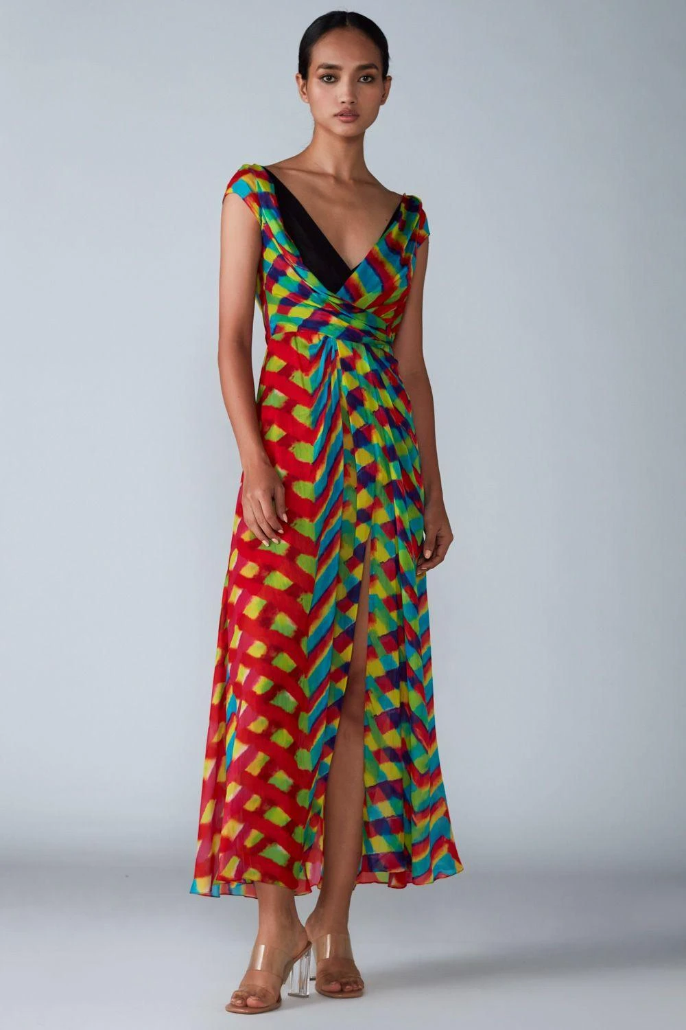 The perfect amalgamation of style & comfort, this dress is perfect for a day out. Crafted in chiffon, this multicoloured dress features a droop neck with a leheriya print all over. This dress comes with an attached inner slip and customisable slits.