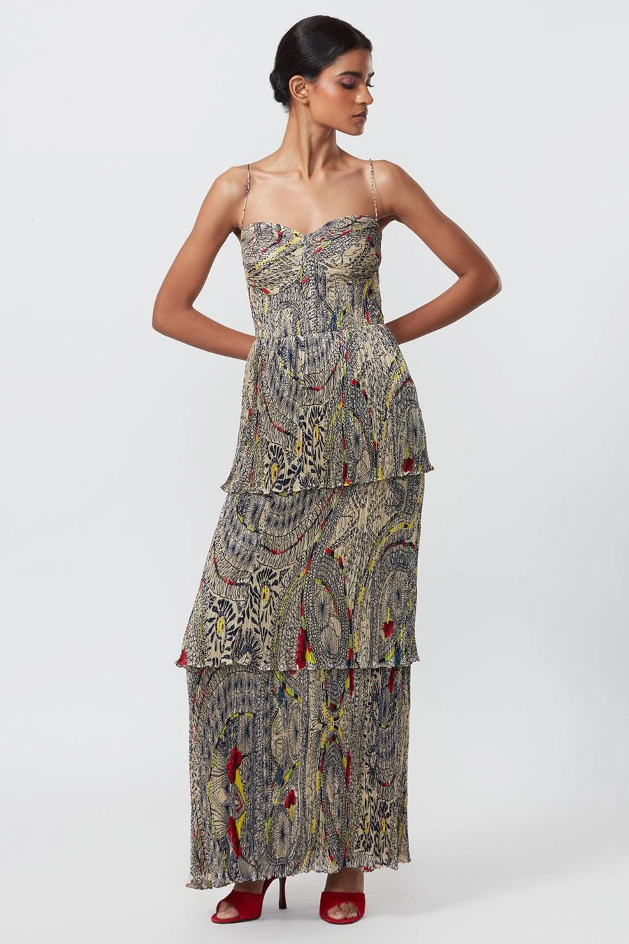 Add a layer of statement and glamour to your resort getaways with this dress. Crafted in chiffon, this micro pleated tiered dress features an abstract print all over. Add a pair of dangler earrings to complete the look.
