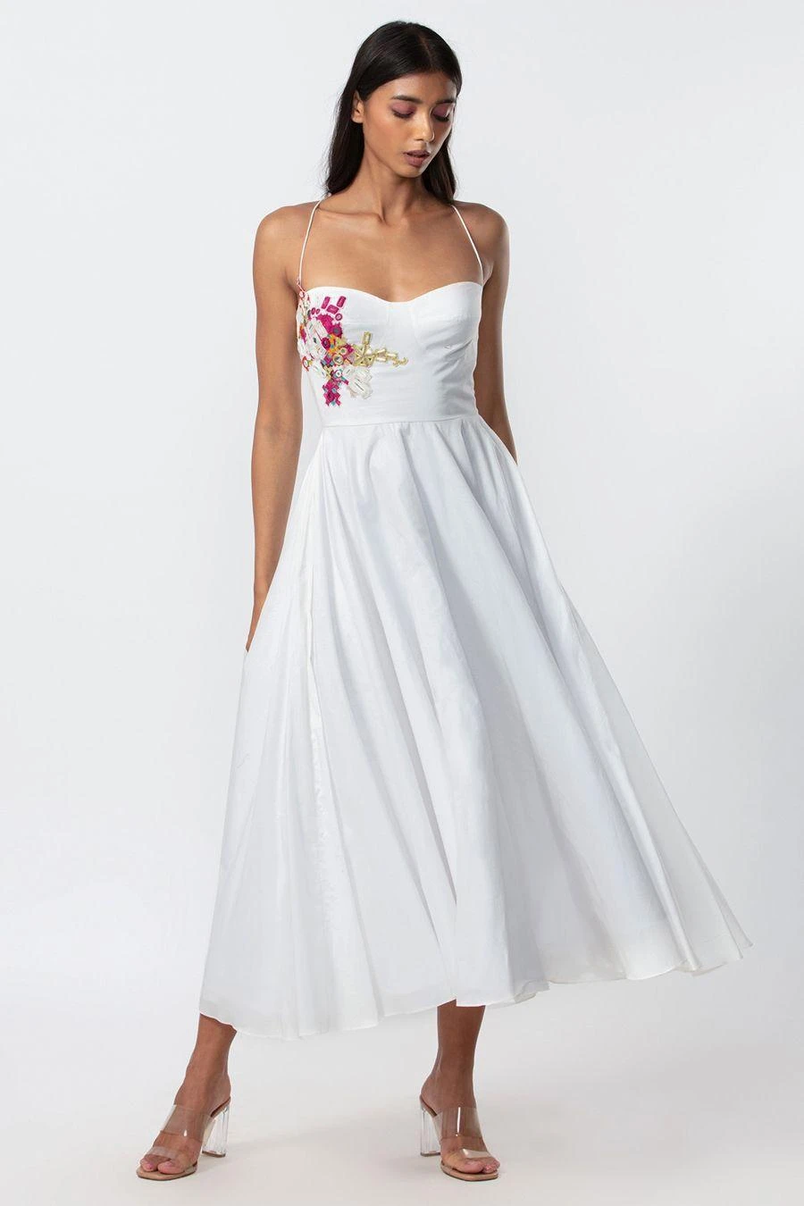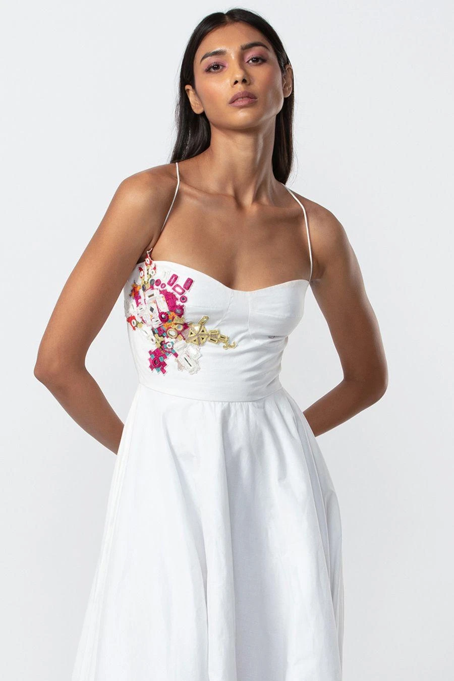 Add a layer of statement and glamour to your resort getaways with this dress. Crafted in cotton, this summer dress features intricate thread and mirror embellished details. Add a pair of dangler earrings to complete the look.