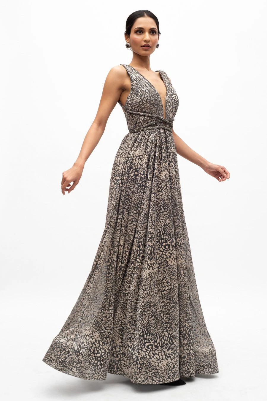 This dreamy sleeveless micro pleated cheetah foil print gown features a plunge neck & hand embellished strap detailing. This ethereal light weight piece is perfect for a cocktail night. It is also crease proof & perfect for traveling.