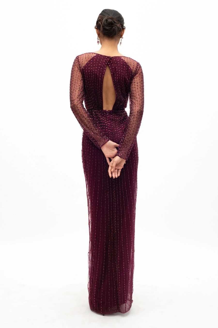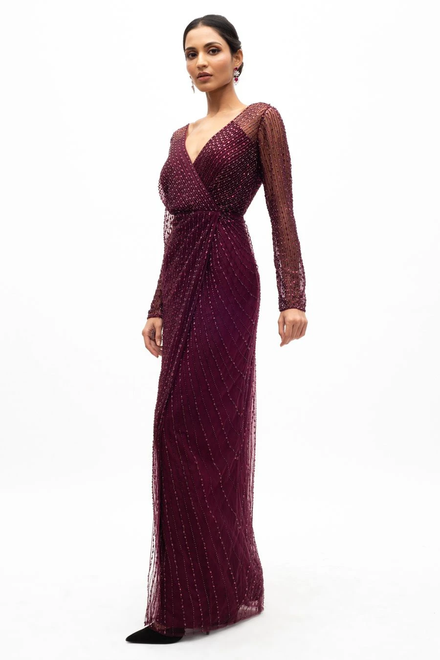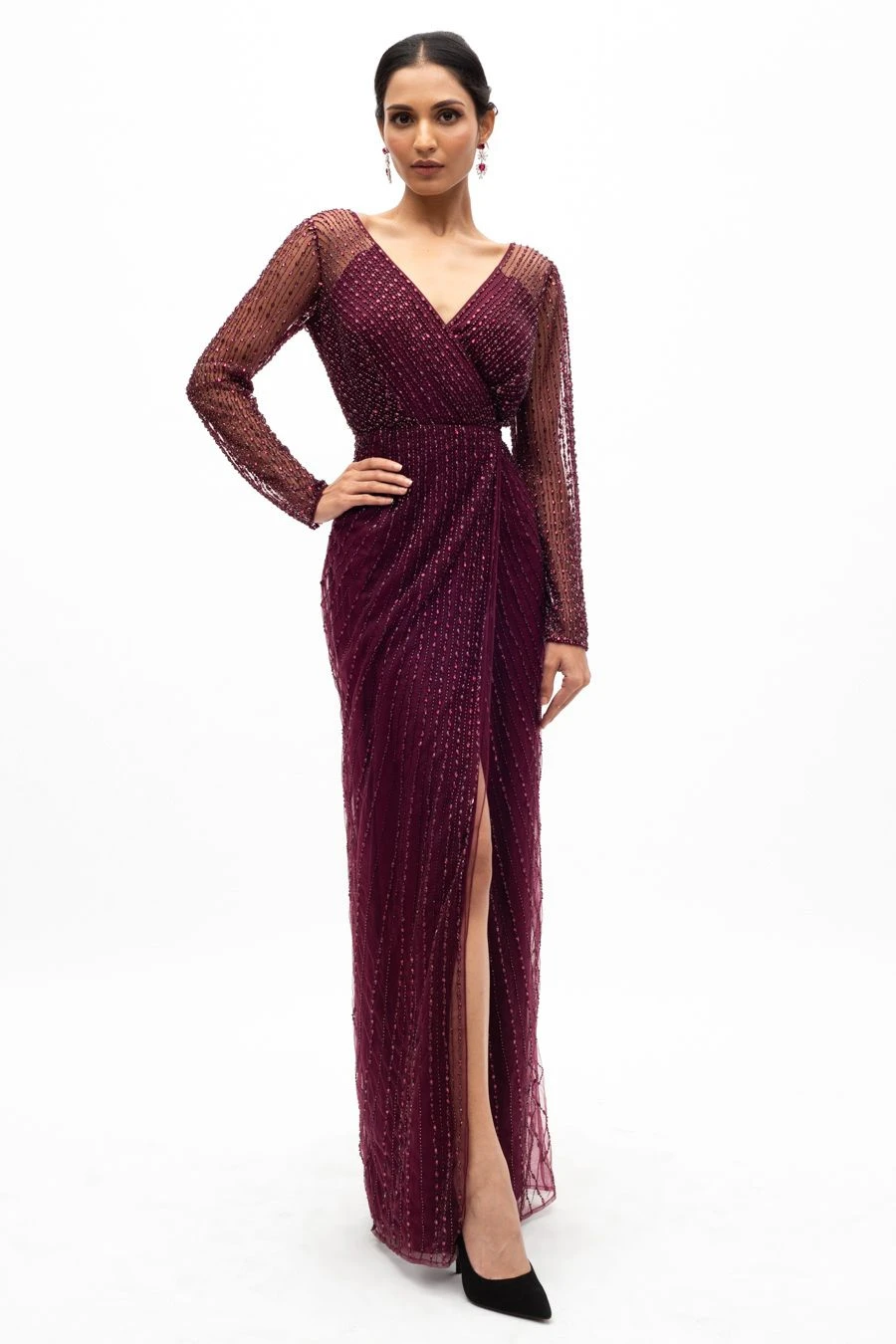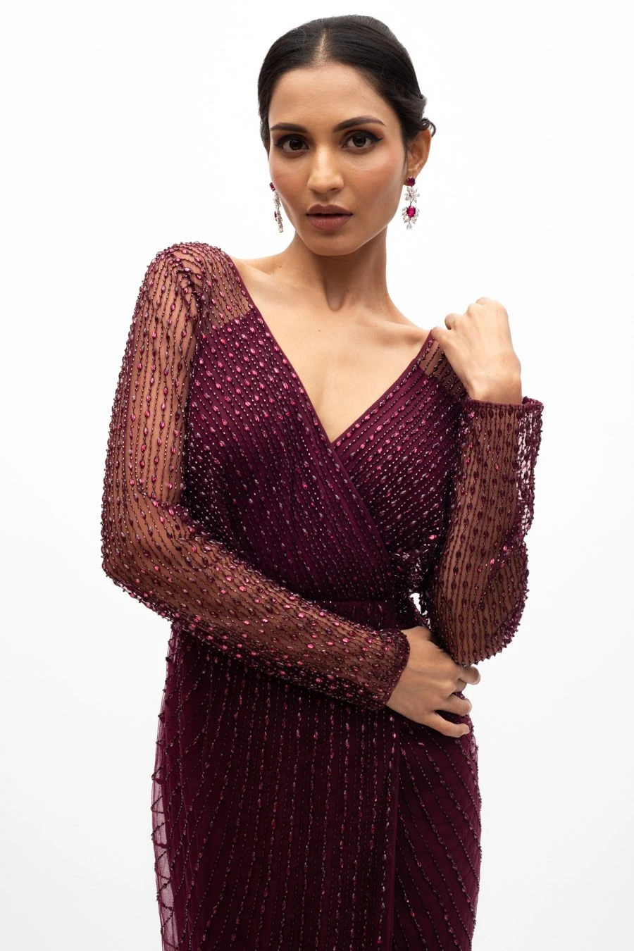 This ethereal red gown is set in hand beaded tulle with a 100% silk lining. It is embellished with hand embroidered crystals & cutdana beads. This dreamy gown is perfect for dressy evening events & cocktail nights.