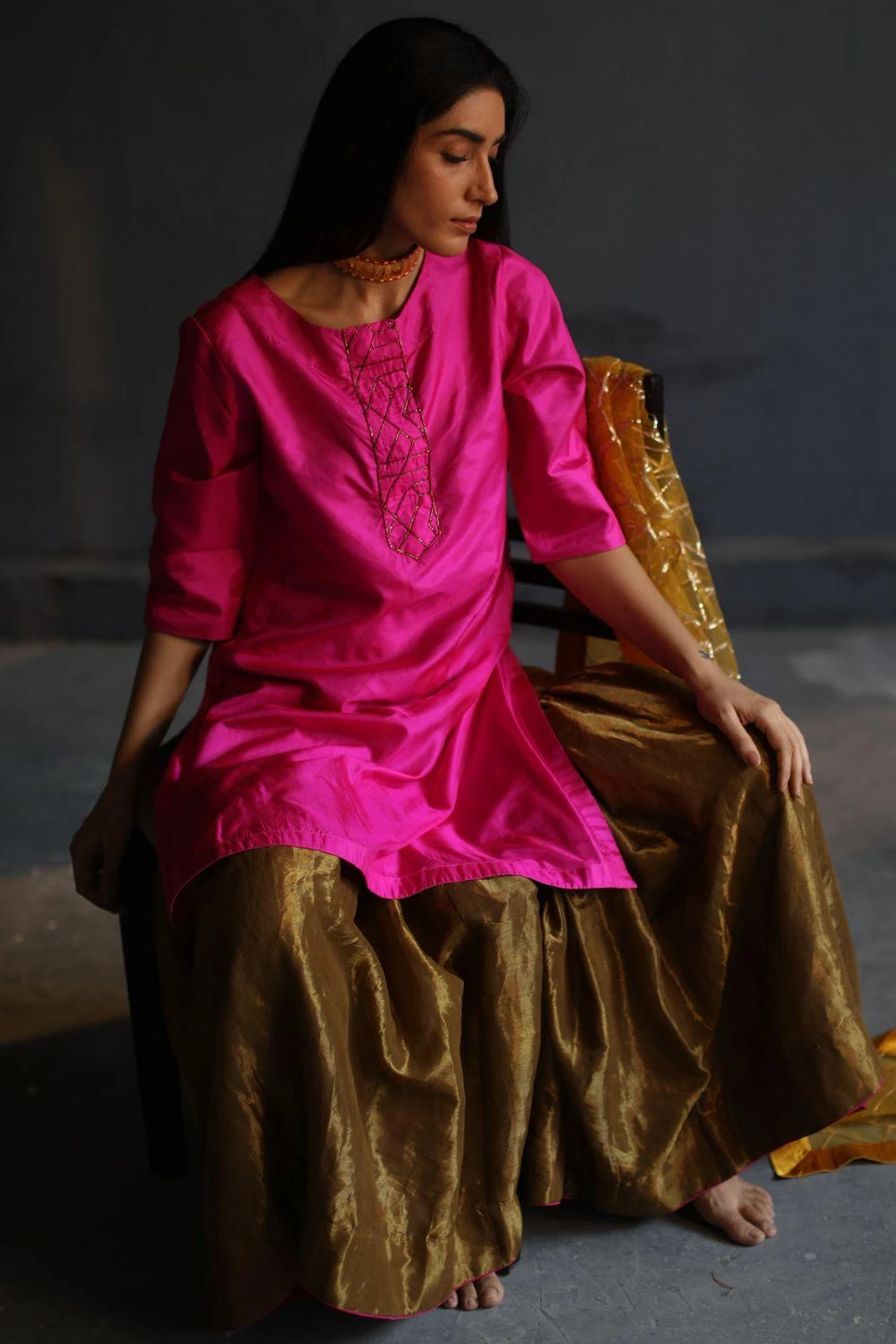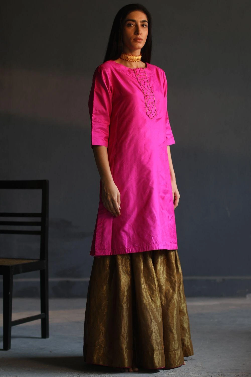 This vibrant pink silk kurta is embellished with delicate embroidery details. It is paired with a flared antique gold tissue sharara. This heirloom piece can be styled with jadau jhumkas or chanbalis for festive occasions.