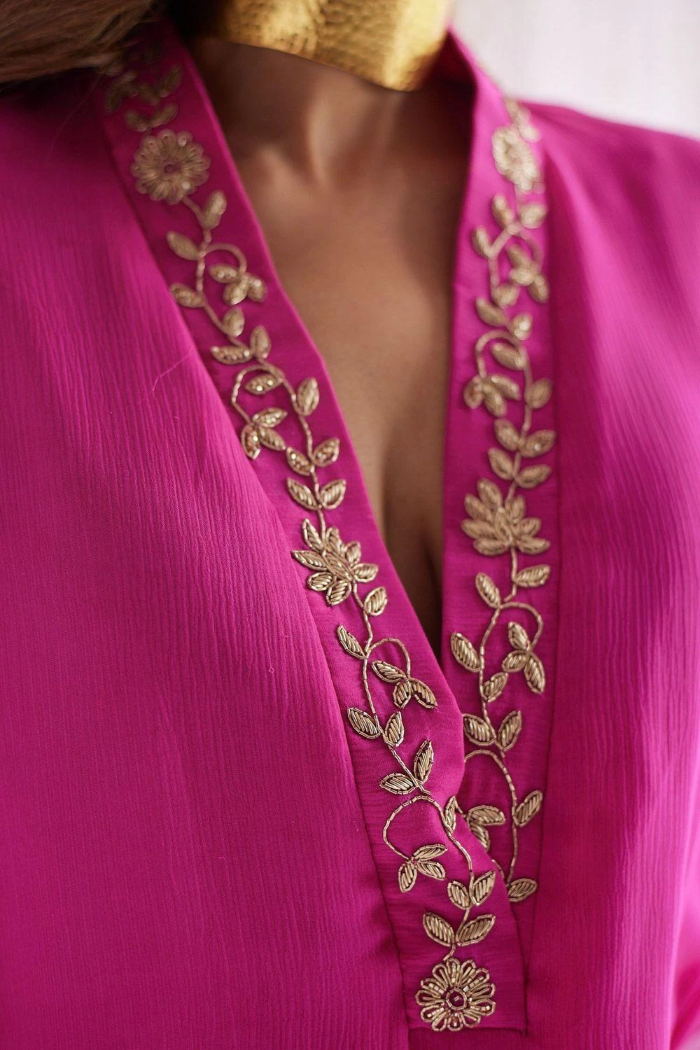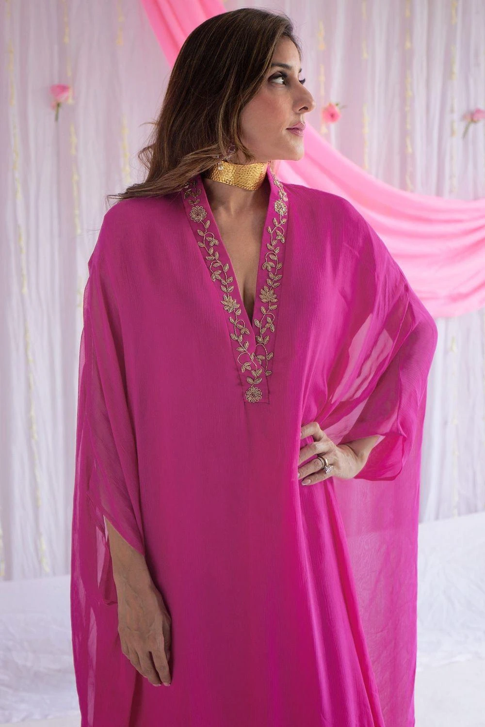 Fuss-free & elegant, this fuchsia pink kaftan is a festive staple outfit. Cut in chiffon, this kaftan features hand embroidered details. Style it with a pair of flared pants and polki earrings to complete the look.