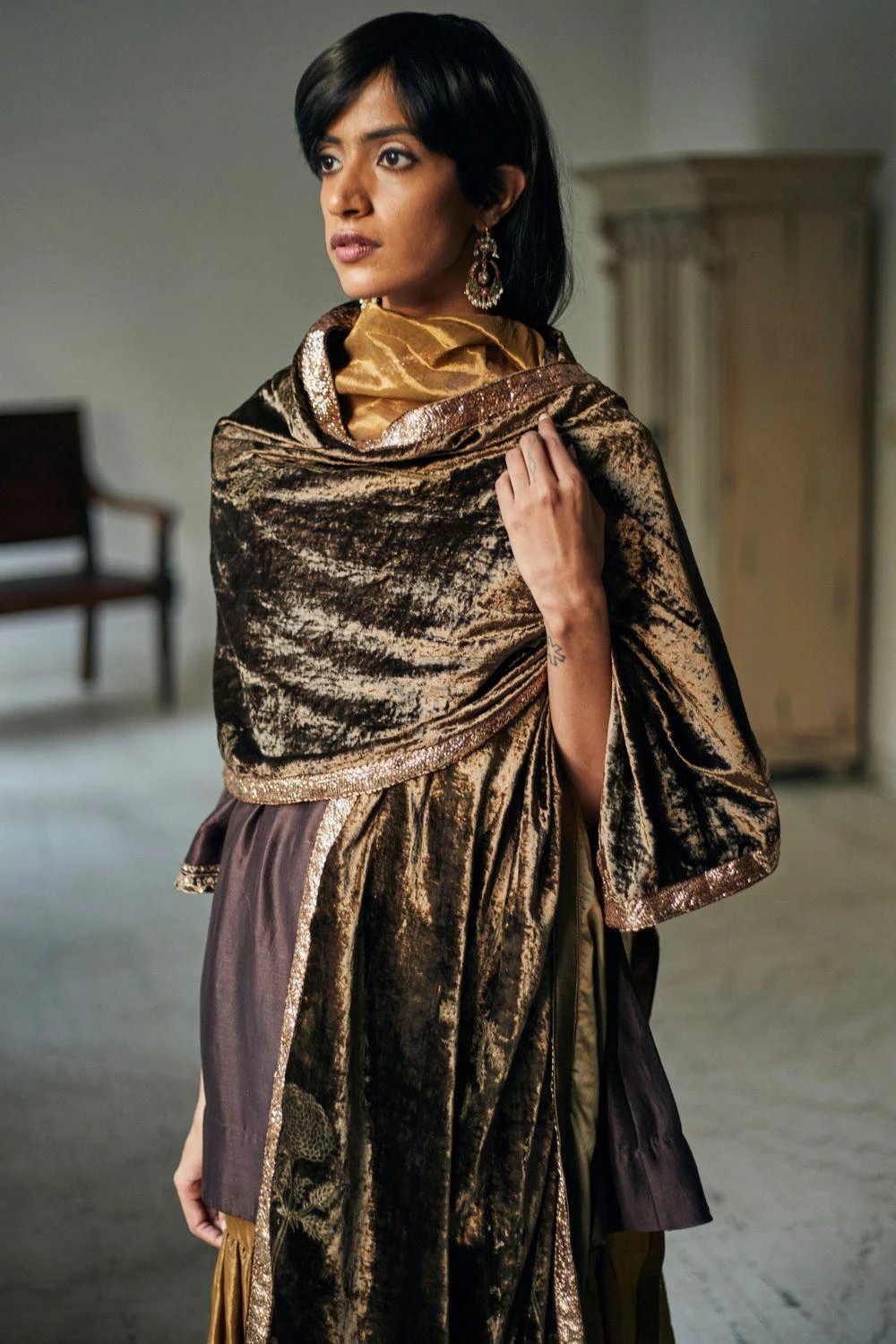 A velvet stole is a wardrobe classic, from a minimal kurta to a heavy embroidered one, this royal piece can instantly elevate any look. This moss velvet stole is enhanced with patchwork & thin gota lace border.