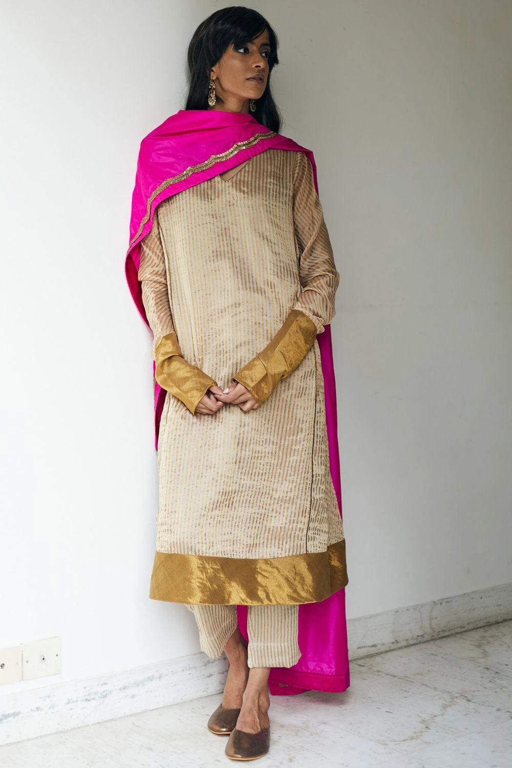 Add a touch of opulence to your festive looks with this eclectic pink stole. It is made in mulberry silk and enhanced with scallop lace work for an added elegance.