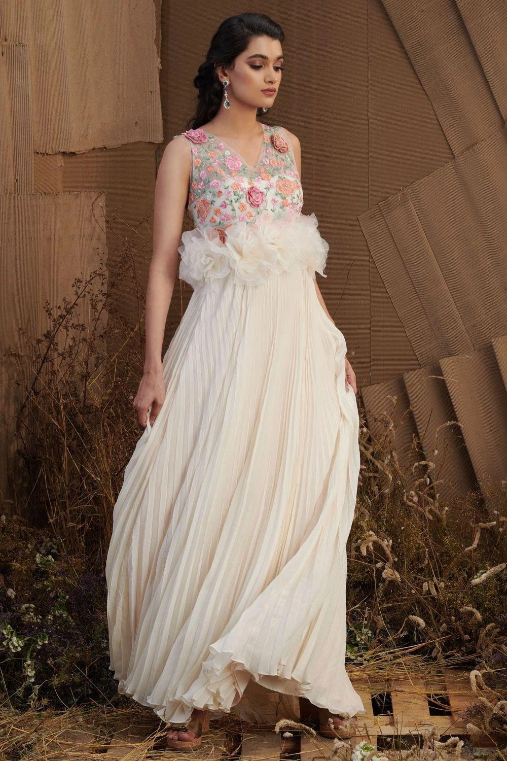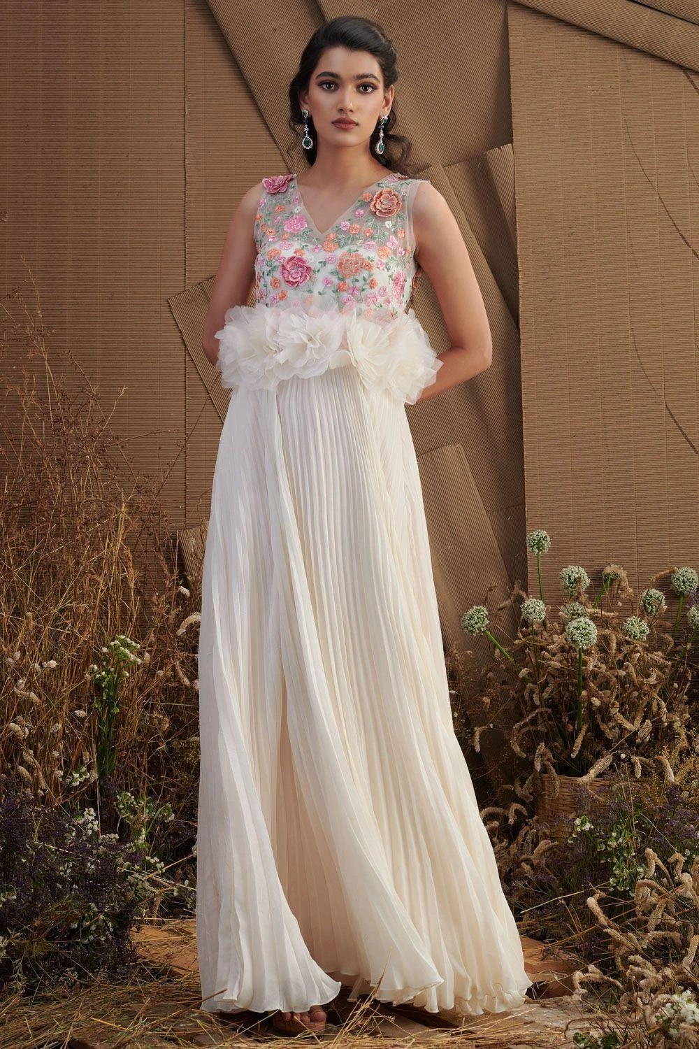 This stunning embroidered gown has a tulle base & upper with a flowy georgette skirt. The gown is fitted at the bust & adorned with colourful floral embroidery.