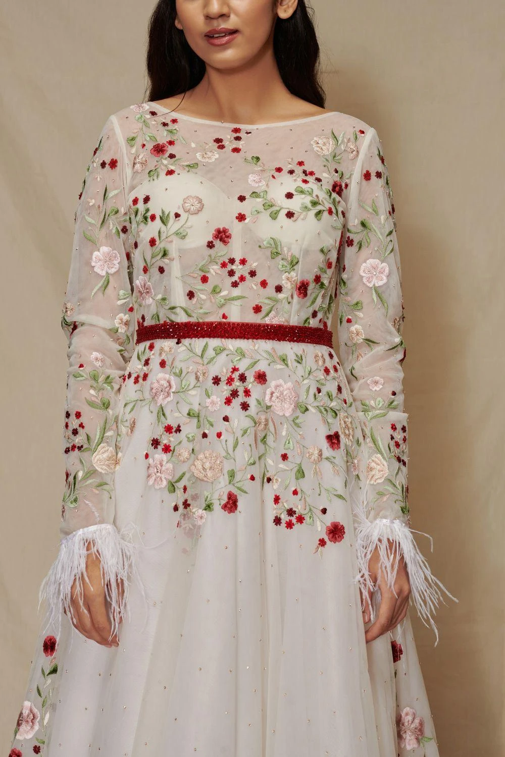 Ace your bridesmaid look in this absolutely stunning ivory gown. It is set in a tulle base and deftly adorned with intricate floral embroidery details and feathers on the cuff. It is further accentuated with a belt.
