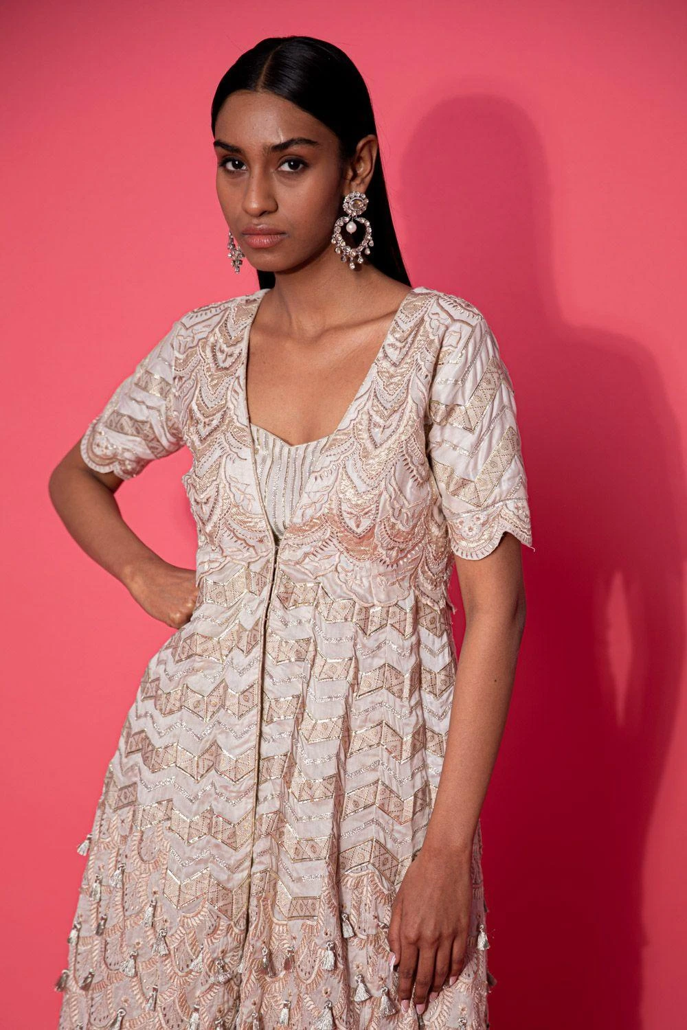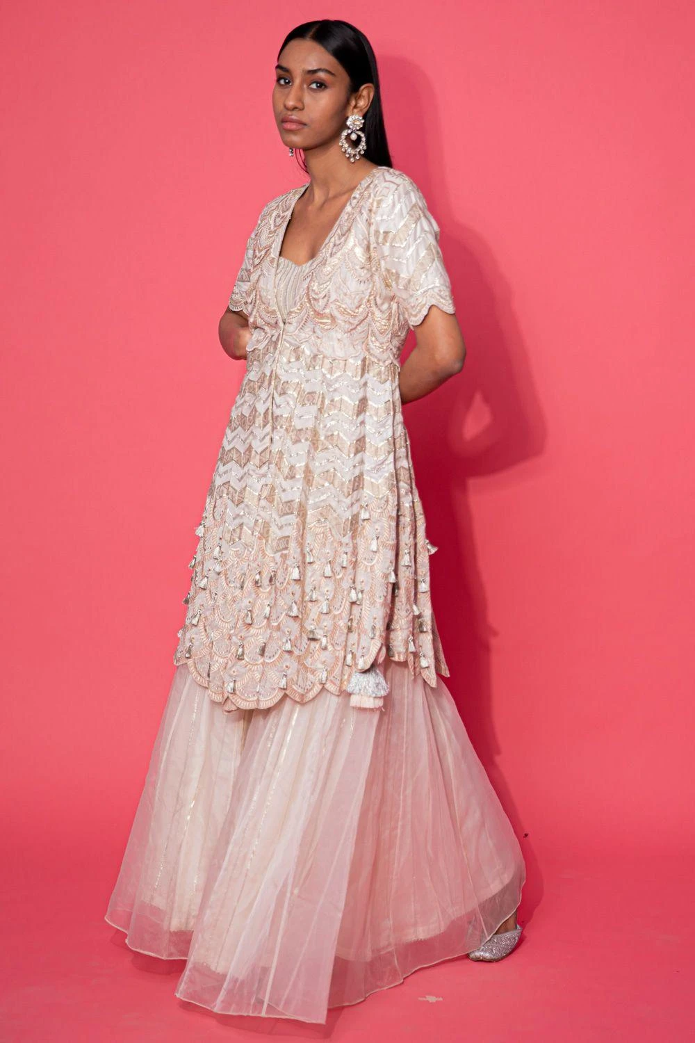 This classic ivory sharara set is a must have in one’s festive wardrobe. It features a thread embroidered jacket highlighted with brocade chevrons & tassels, paired with a delicate organza sharara and a gota bustier.