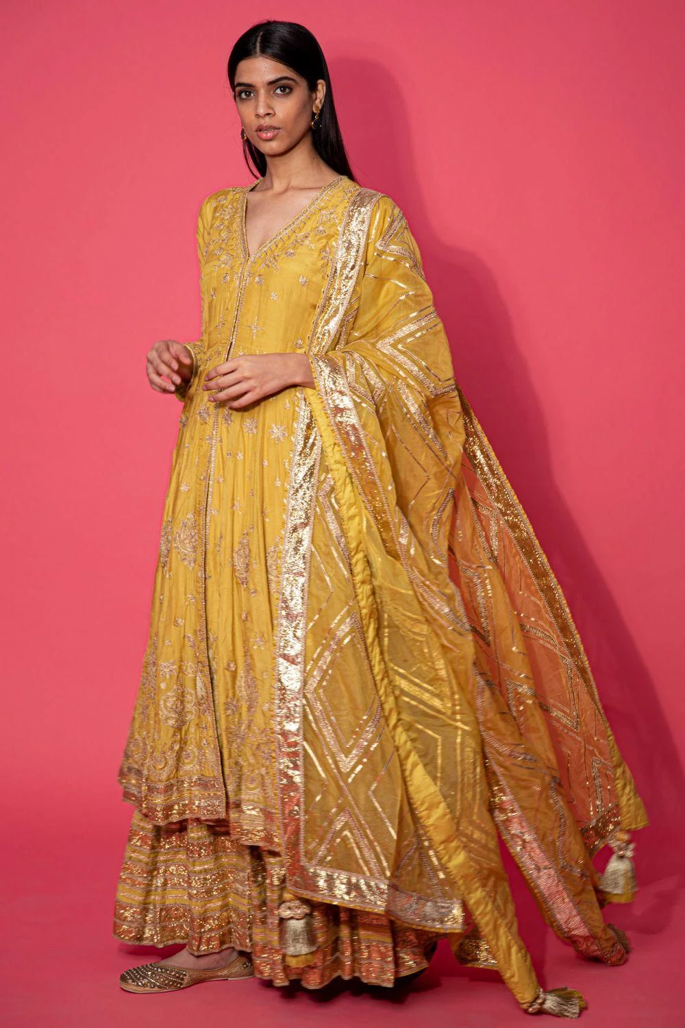 This mustard yellow kurta in cotton silk has delicate aari and badla embroidery that give it the perfect amount of festive vibe. It is paired with a cotton silk vintage gota sharara and an organza dupatta with gota.
