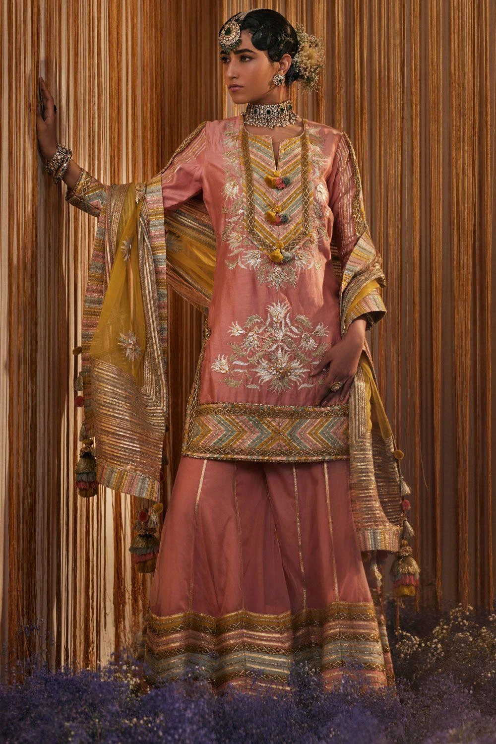 This sharara set will see you through all kinds of celebrations this festive season. It comes with a short chanderi kurta with a heavily embellished neckline paired with a sharara & a gota embroidered organza dupatta.