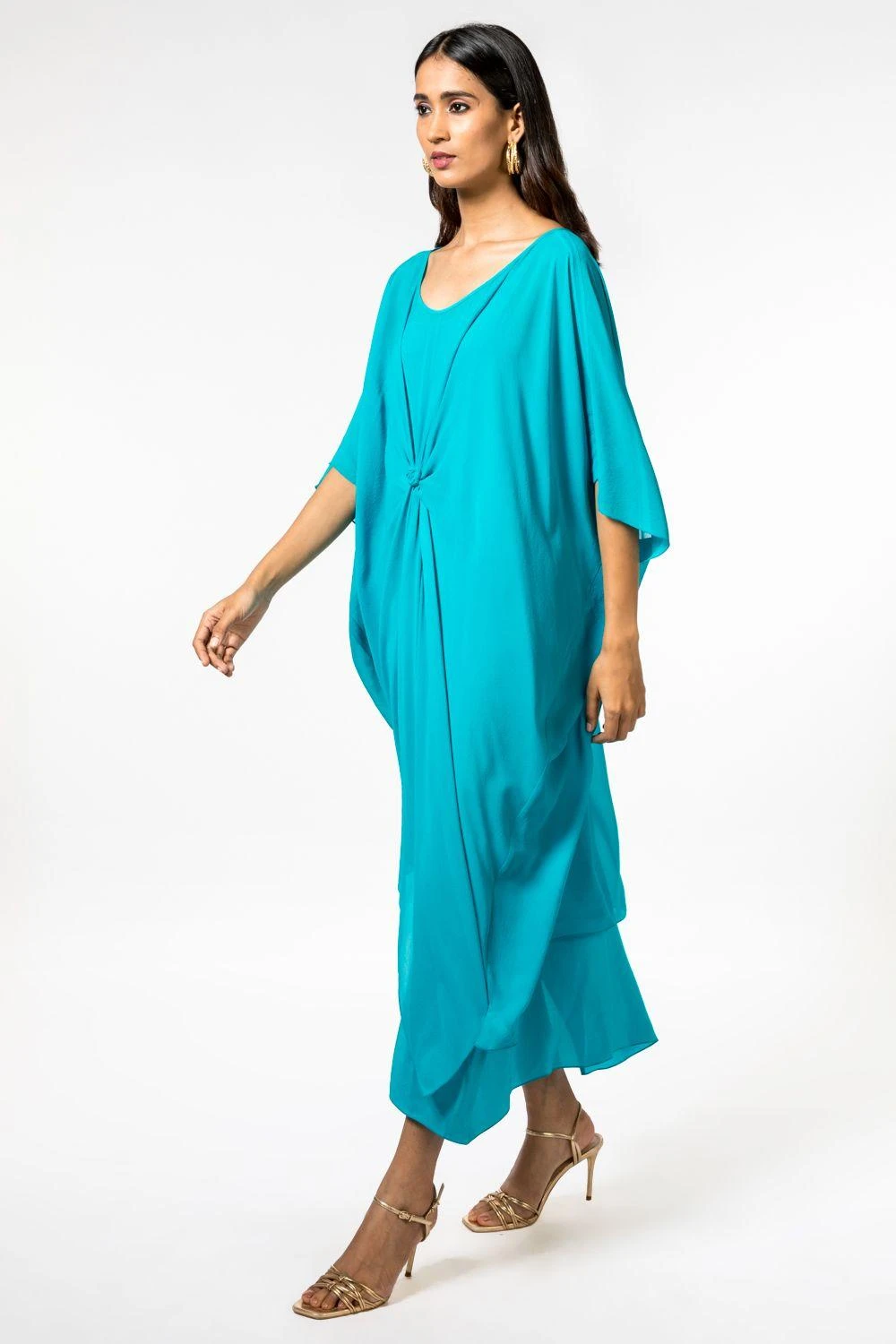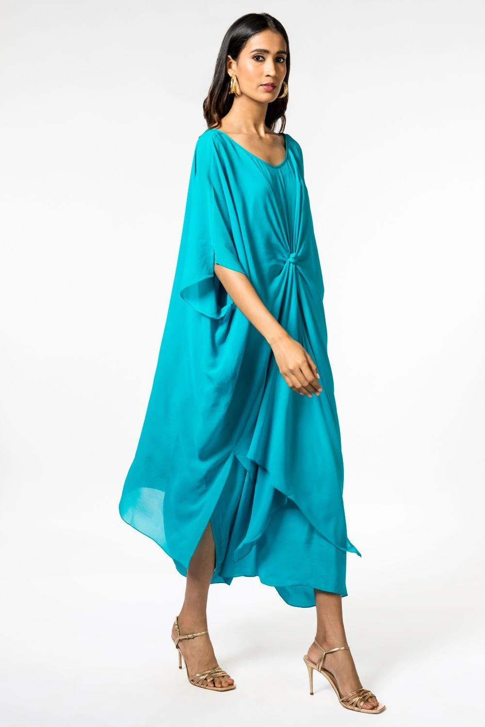 Easy & breezy, this bright blue kaftan dress is a great holiday pick. It is cut in silk georgette with a front knot detail. It comes with a matching silk crepe inner, fetching a beautiful layered look.