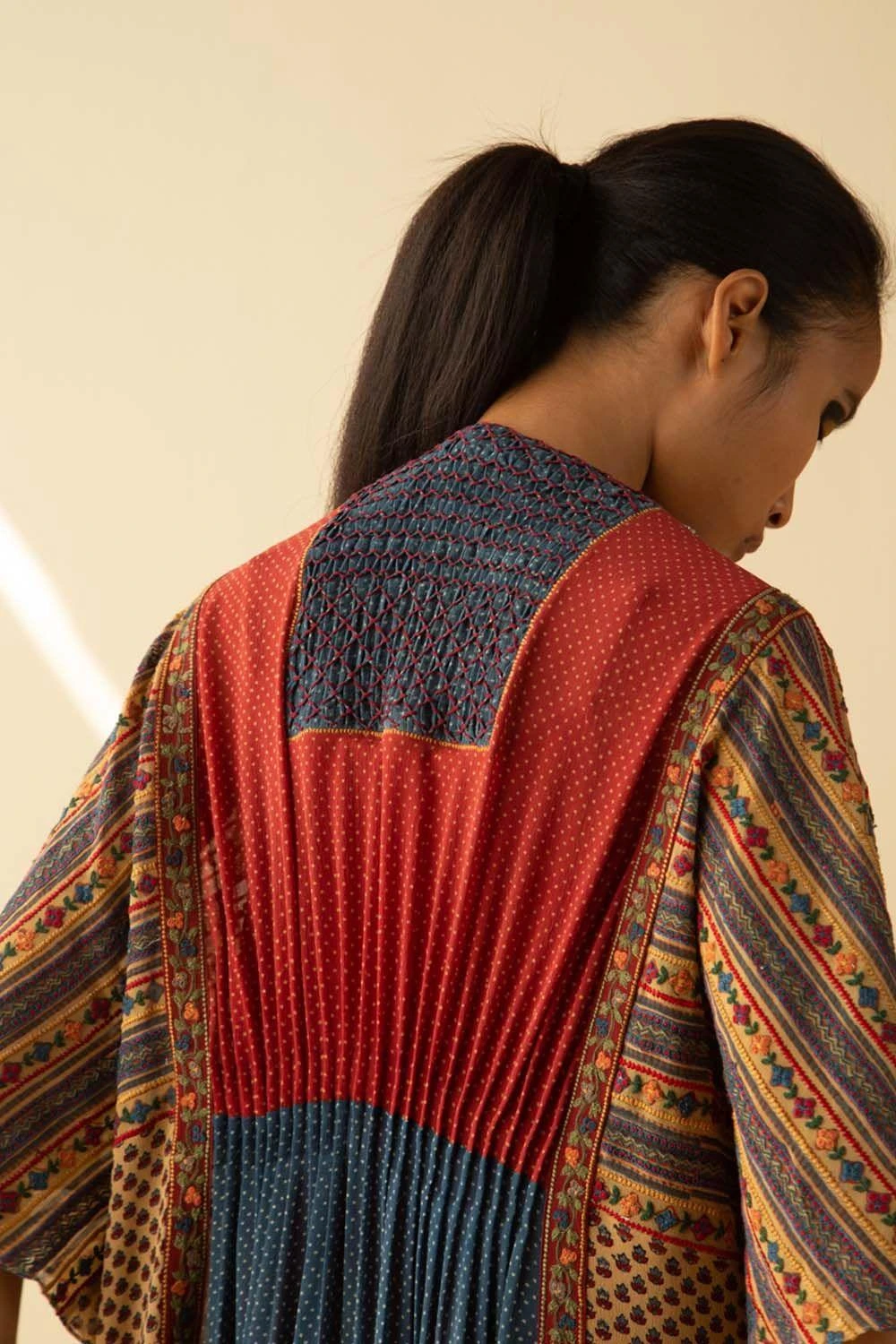 Presenting the summer essential with a dash of poise and elegance. This Ajrakh block printed kaftan is sewn in pleats and gathers to render a fit-and-flare silhouette. Embracing fanciful threadwork on its butterfly sleeves. Effortlessly feminine.
