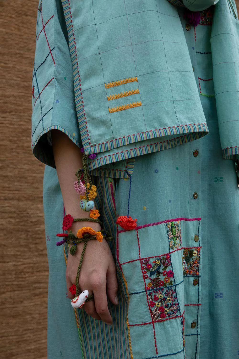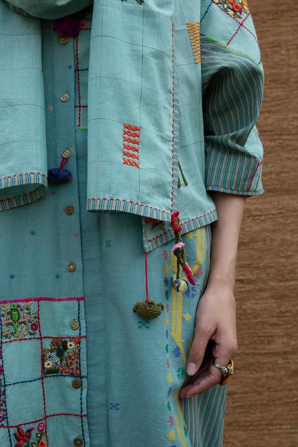 This blue stole is crafted in jamdani muslin along with embroidery stitch details, adding to the subtle craftsmanship & colour. You can wrap it around your neck with a coordinating kurta set for a dressed up look.
