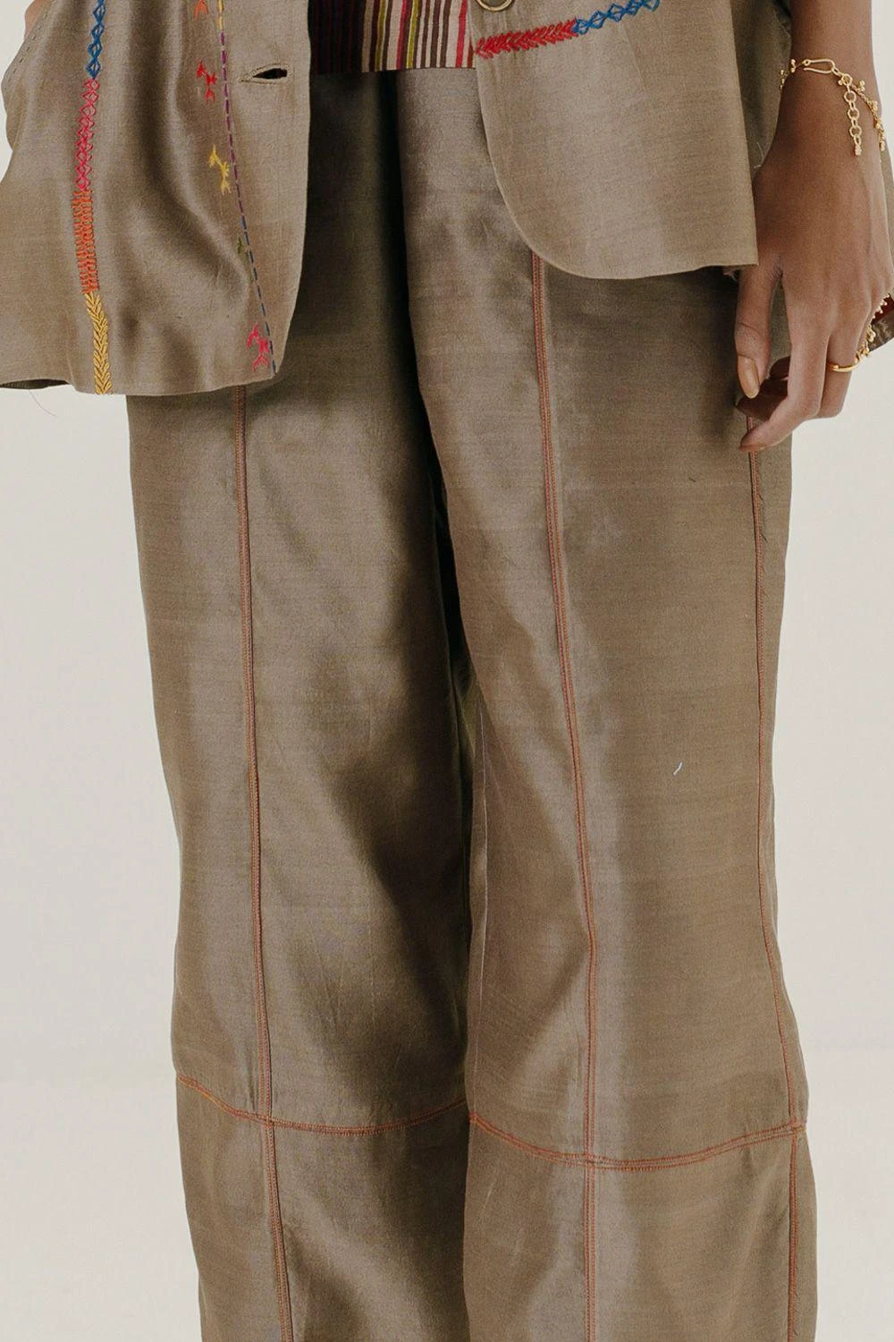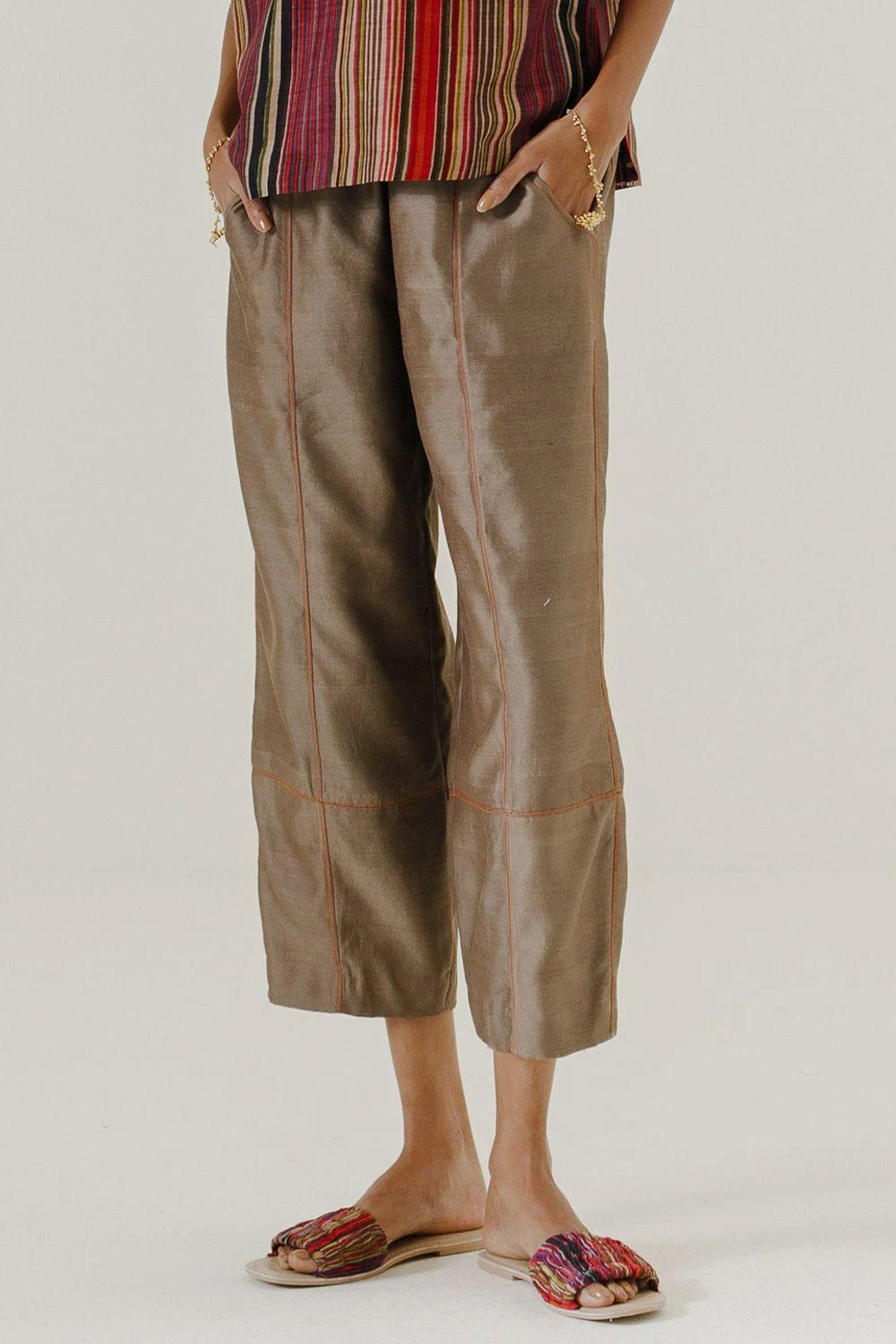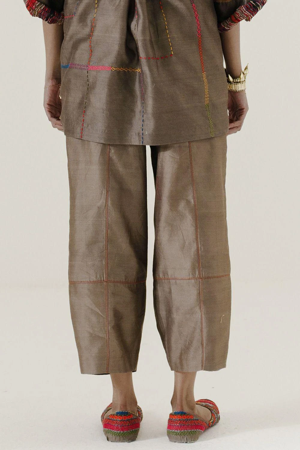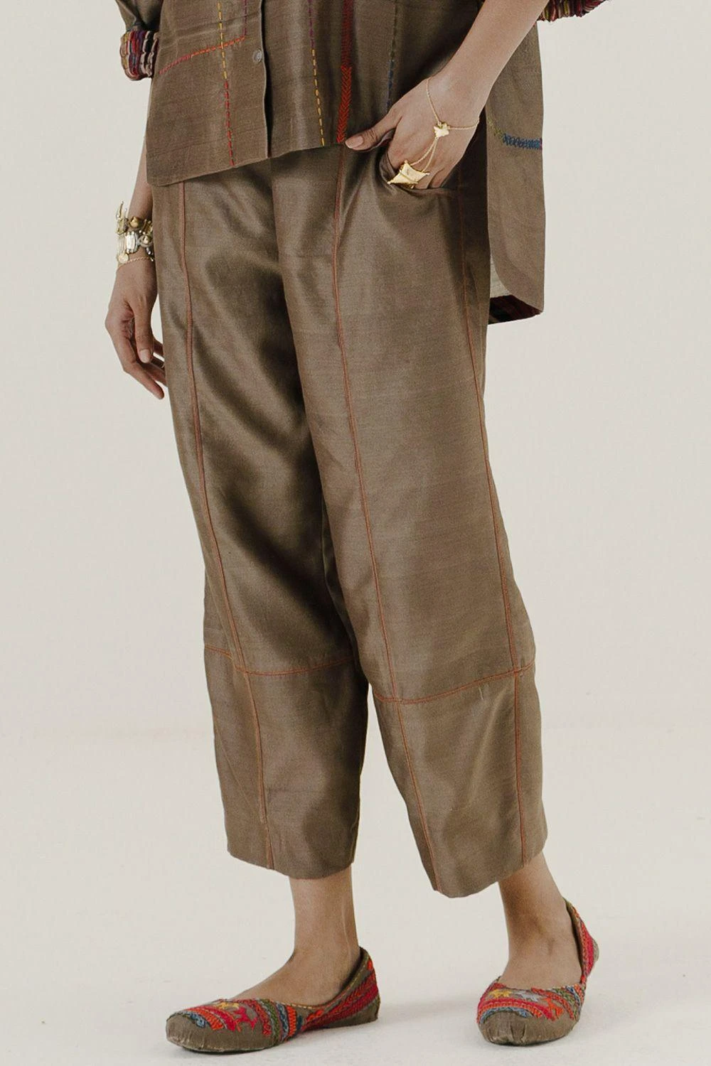 Crafted in handwoven chanderi, these brown mool pants feature a cowl boho style with an elastic waist band at the back and drawstring at the front for maximum comfort. Style these with the brown high low mool top to complete the set.