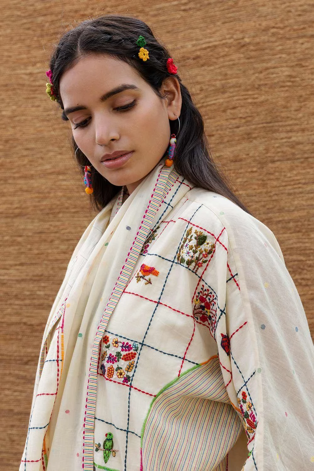 This kora patchwork stole is crafted in jamdani muslin with intricate embroidery inspired by spring flowers & birds. You can wrap it around your neck with a coordinating kurta set for a dressed up look.