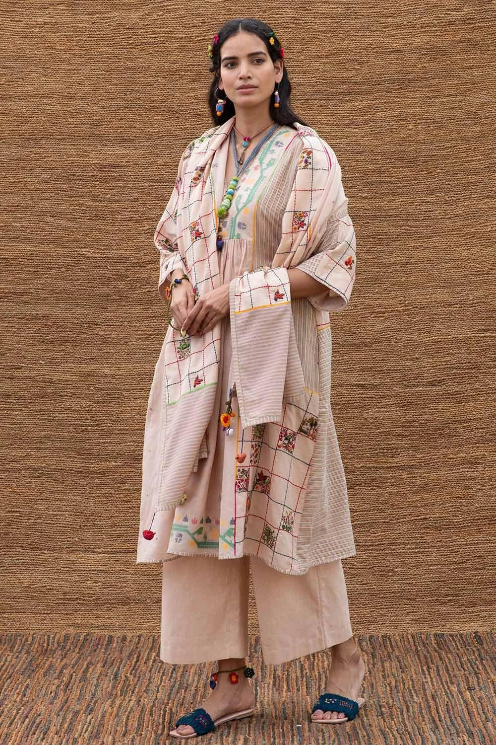 This pink patchwork stole is crafted in jamdani muslin with intricate embroidery inspired by spring flowers & birds. You can wrap it around your neck with a coordinating kurta set for a dressed up look.
