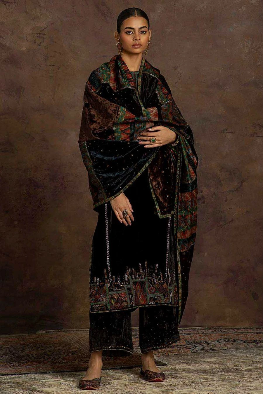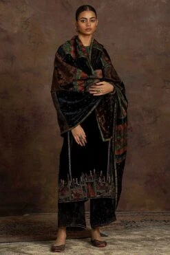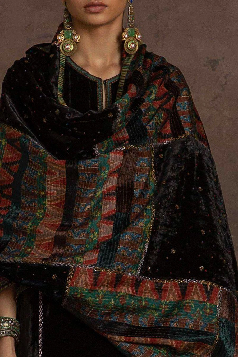This statement doshala is crafted with different patches of hand-block printed Bagru silk textile and silk velvet, with antique stitches. The velvet patches features hand embroidery, giving it a sparkling effect.