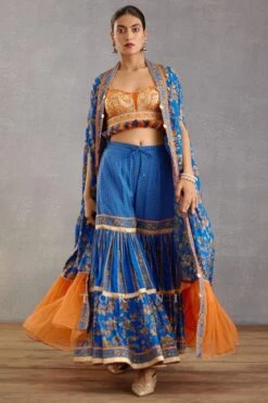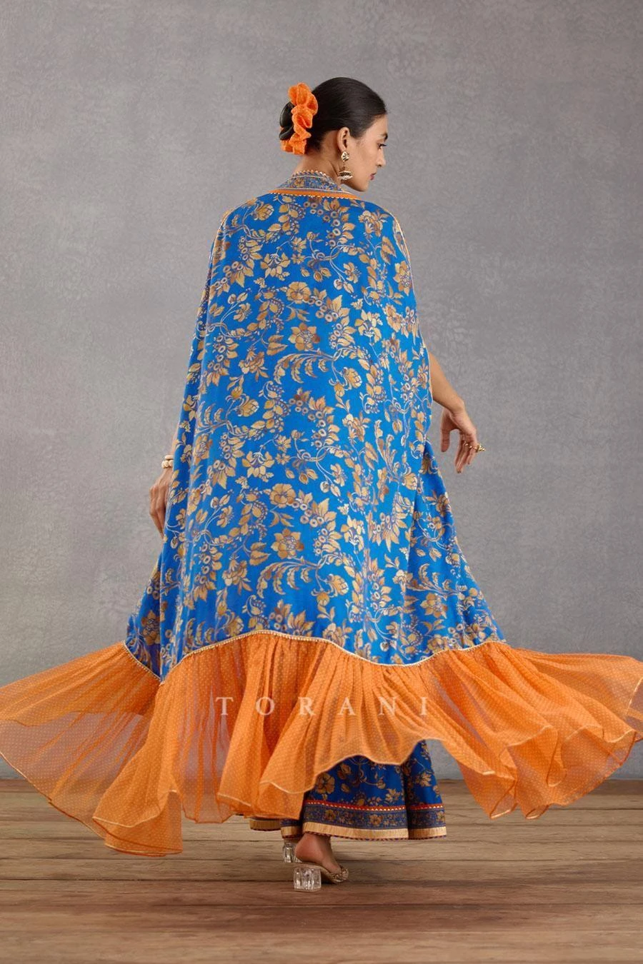 The perfect amalgamation of style and comfort, this sharara set work across occasions. Crafted in slub silk, this set features a chintz printed sharara paired with a coordinating blouse and cape.