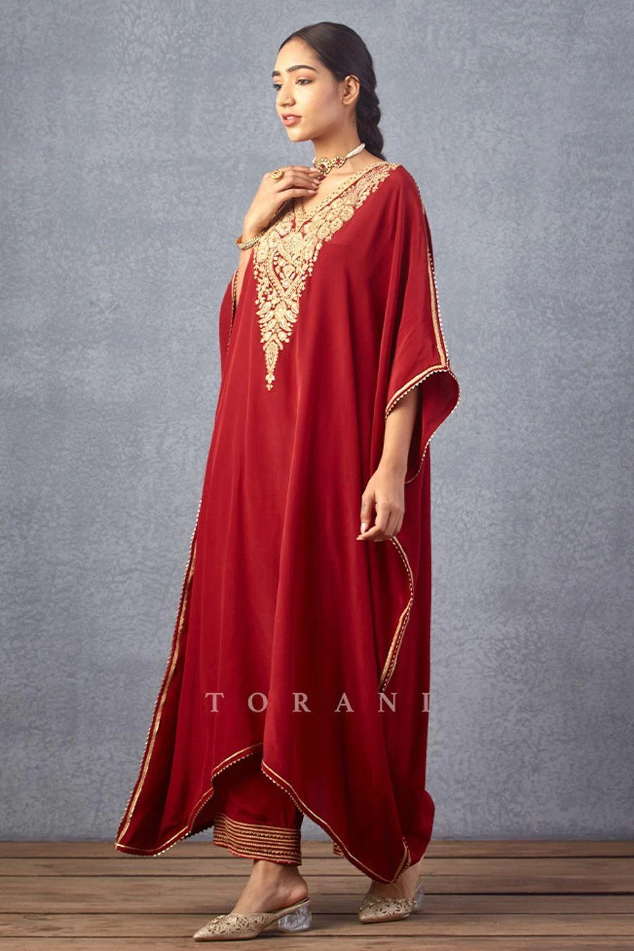 The perfect amalgamation of style and comfort, this kaftan set works across occasions. Crafted in silk, this set features a hand embroidered adda work kaftan paired with matching pants.