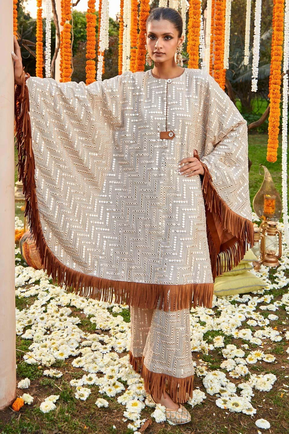 On a vacation or at a celebration, this grey kaftan set will suit all your occasions. It is cut in georgette and is computer embroidered with great precision, giving a mirror work effect. It is further accented with suede tassels.