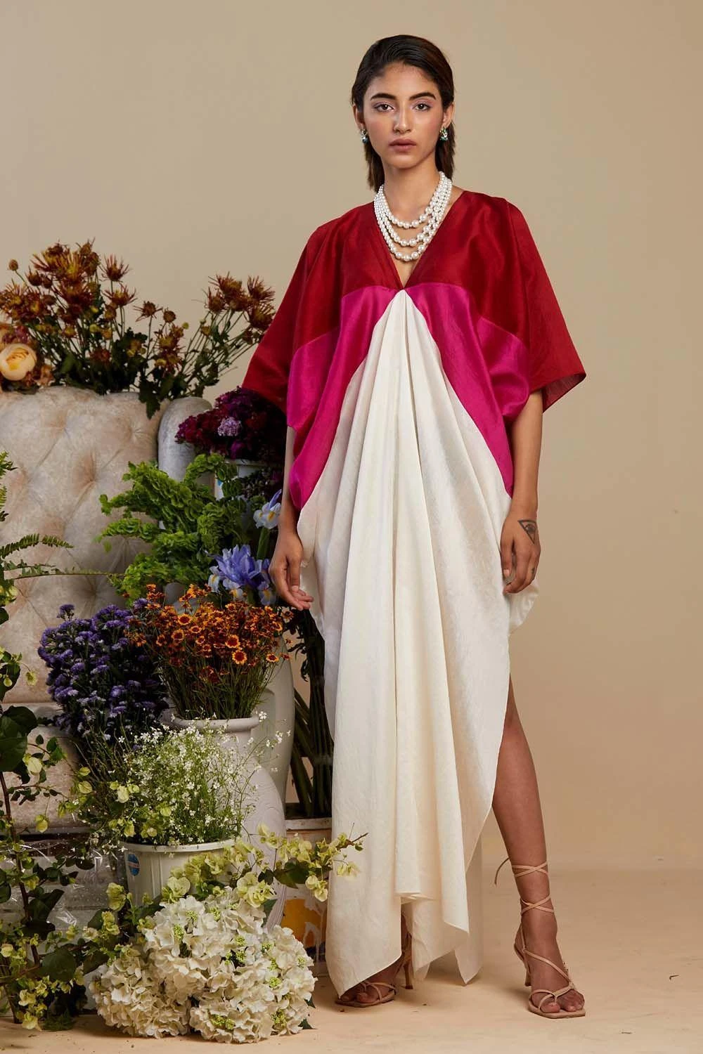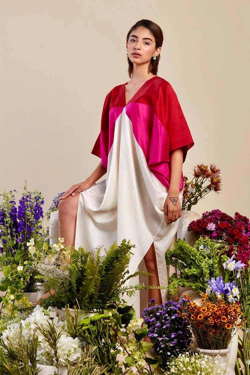 This handloom chanderi colour blocked kaftan is a great summertime outfit. The flowy drape & airy fabric makes this a great choice for daytime events.